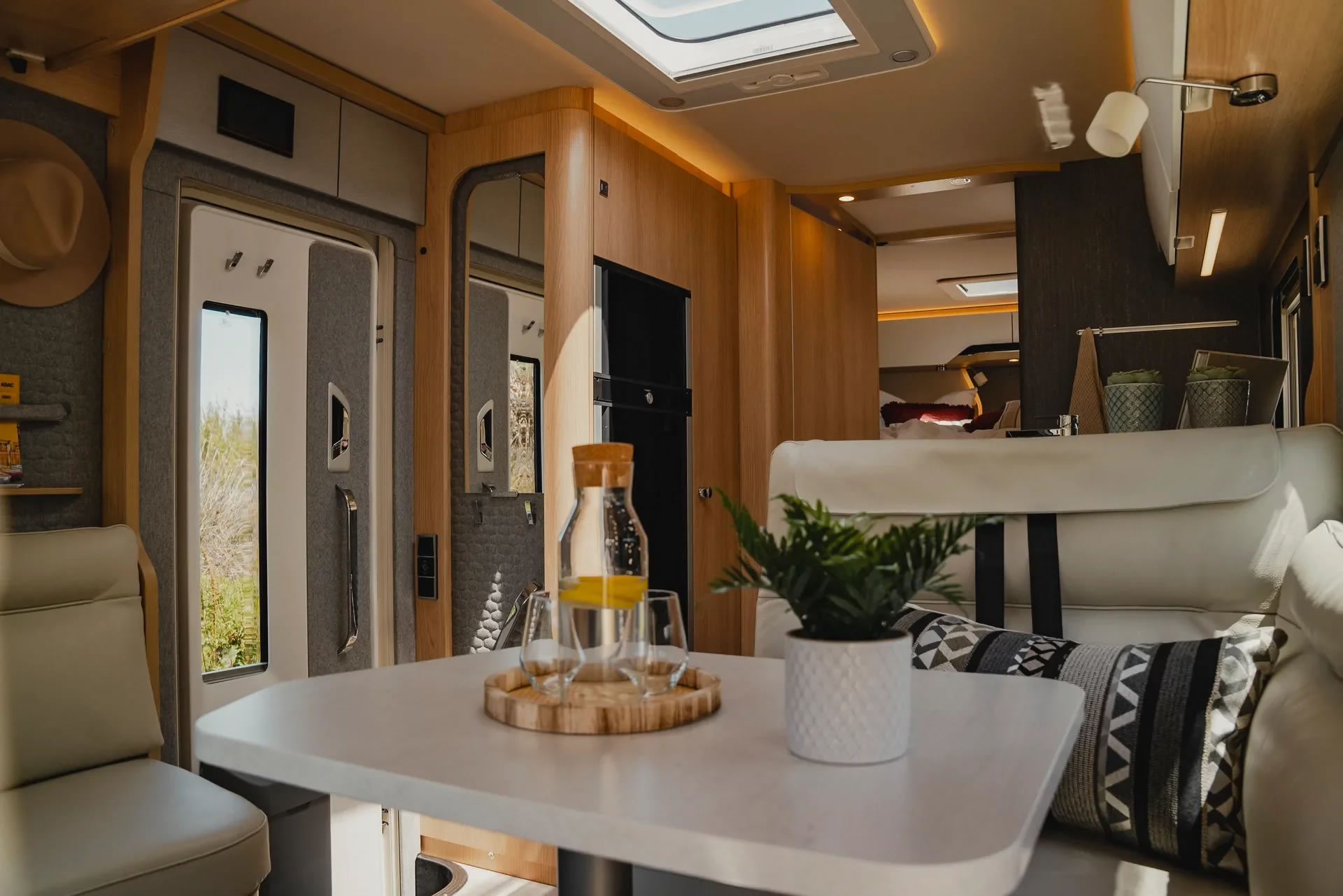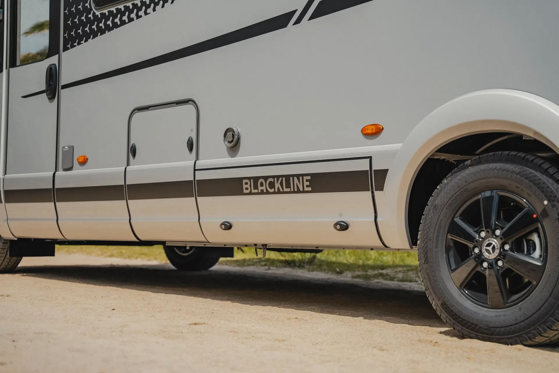 Interiér BlackLine zaujme moderní a stylovou atmosférou. Betonový vzhled podlahy v kombinaci s teplým dekorem nábytku Grand Oak dalece přesahuje standard klasických obytných vozů.