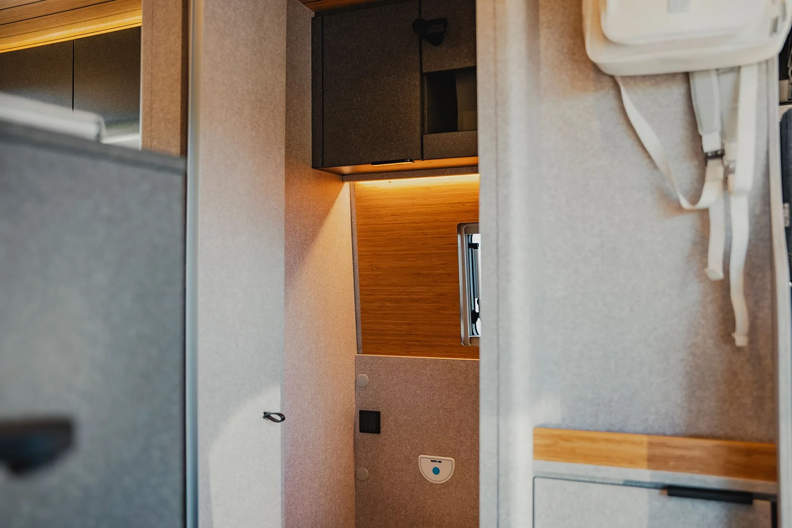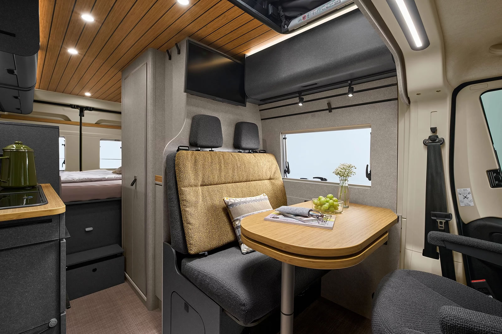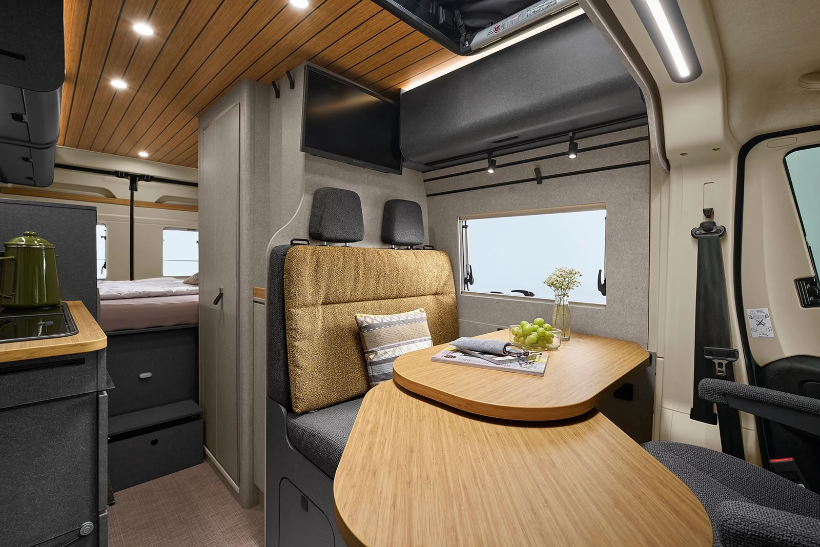 Bambusové povrchy, textilní akcenty a texturovaný dřevěný strop nově definují interiér. Ambientní osvětlení a chytrá úložná řešení zajišťují stylový a útulný cestovní zážitek. HYMER Redwood nastavuje nové standardy v základní třídě.