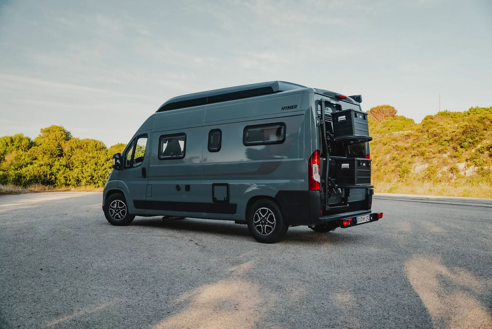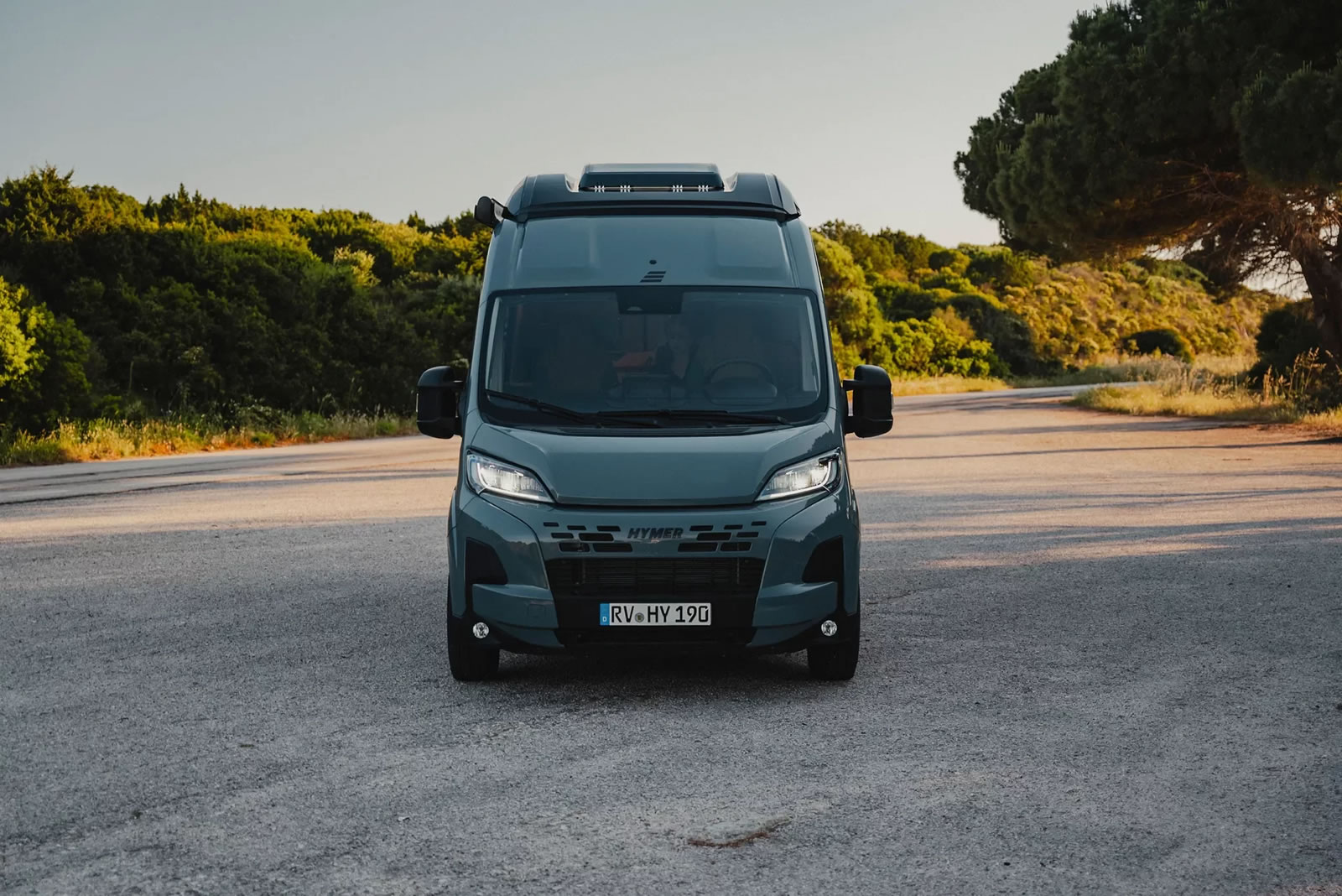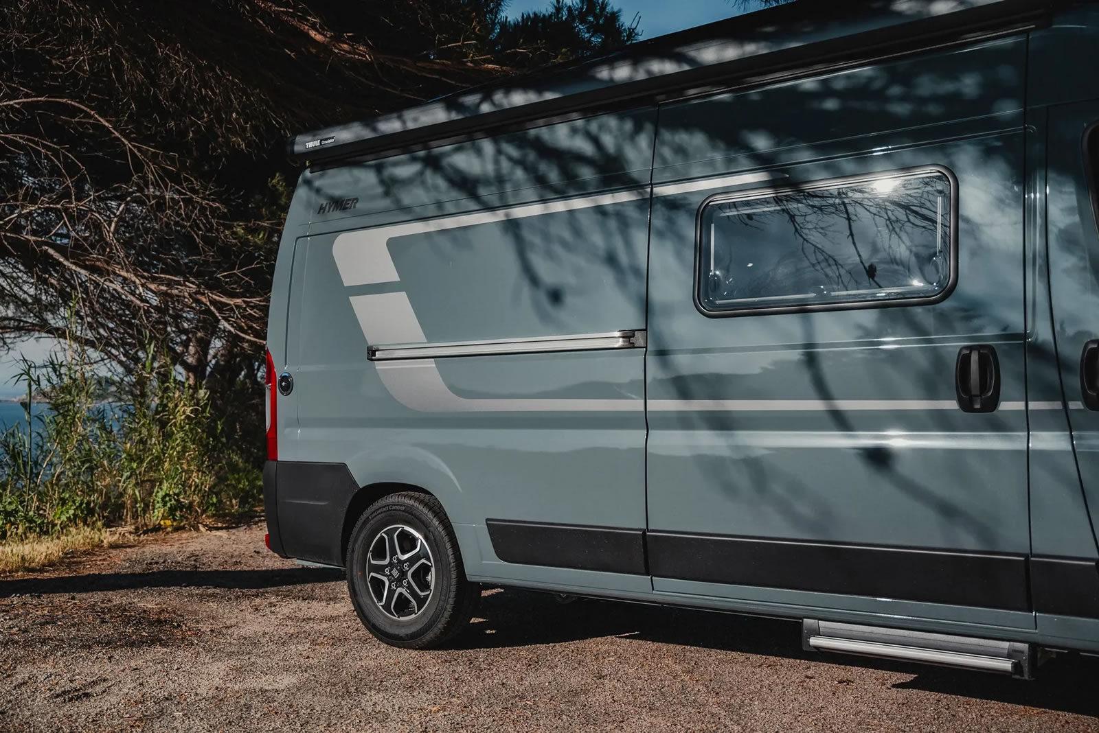 HYMER Redwood zaujme svou výraznou tváří: Ať už v barvách Grigio Campovolo, Storm Blue Metallic nebo Lanzarote Grey, laky karoserie dodávají akcenty. Orámovaná okna pro bezproblémový design, matně černá 16palcová kola a sladěné detaily karoserie mu dodávají moderní a sebevědomý vzhled.