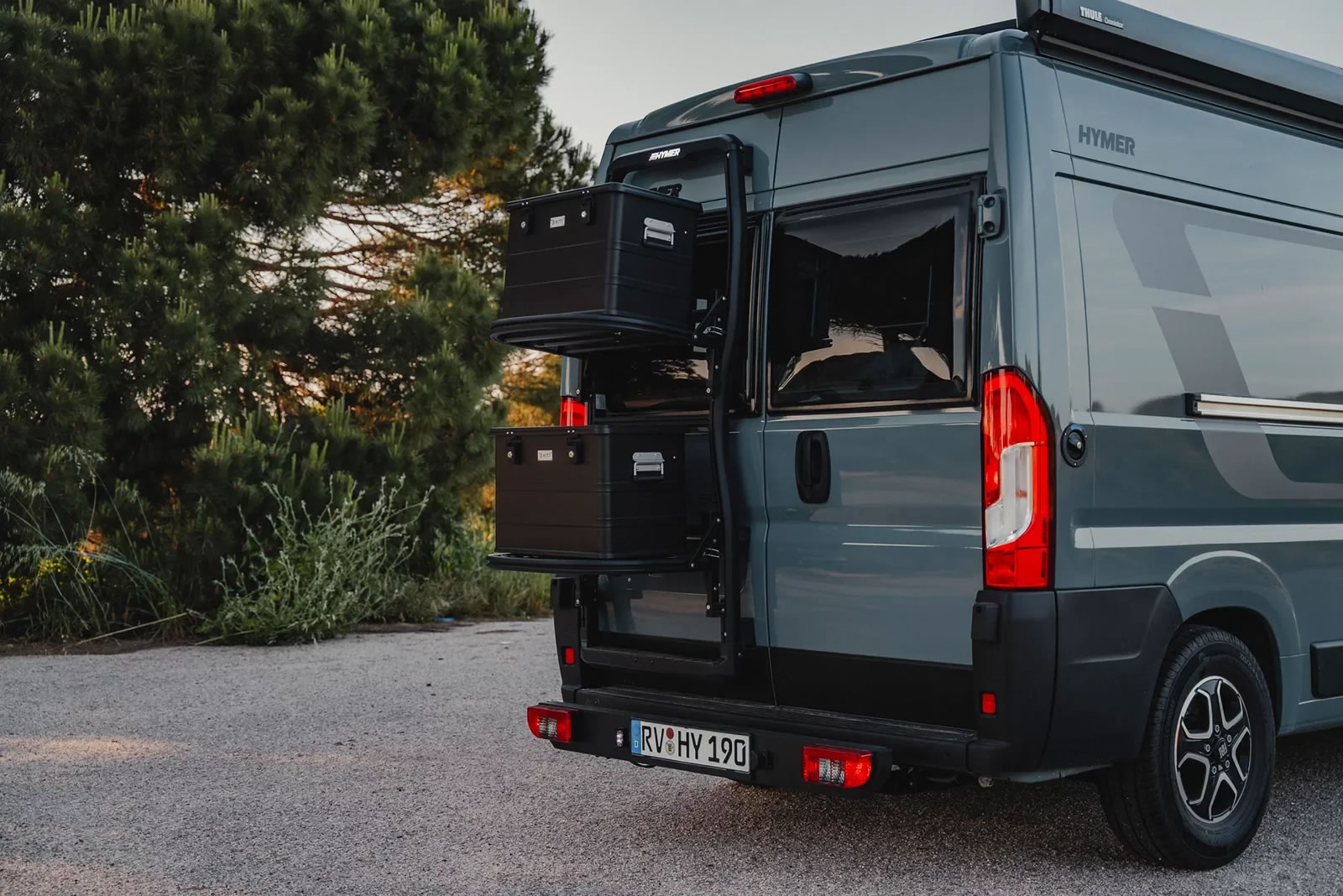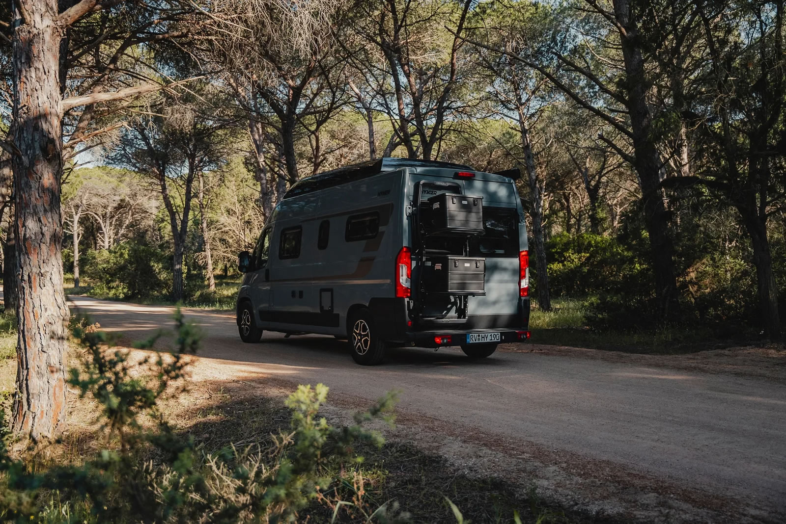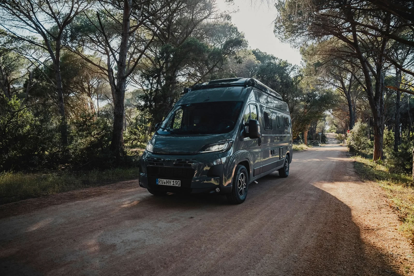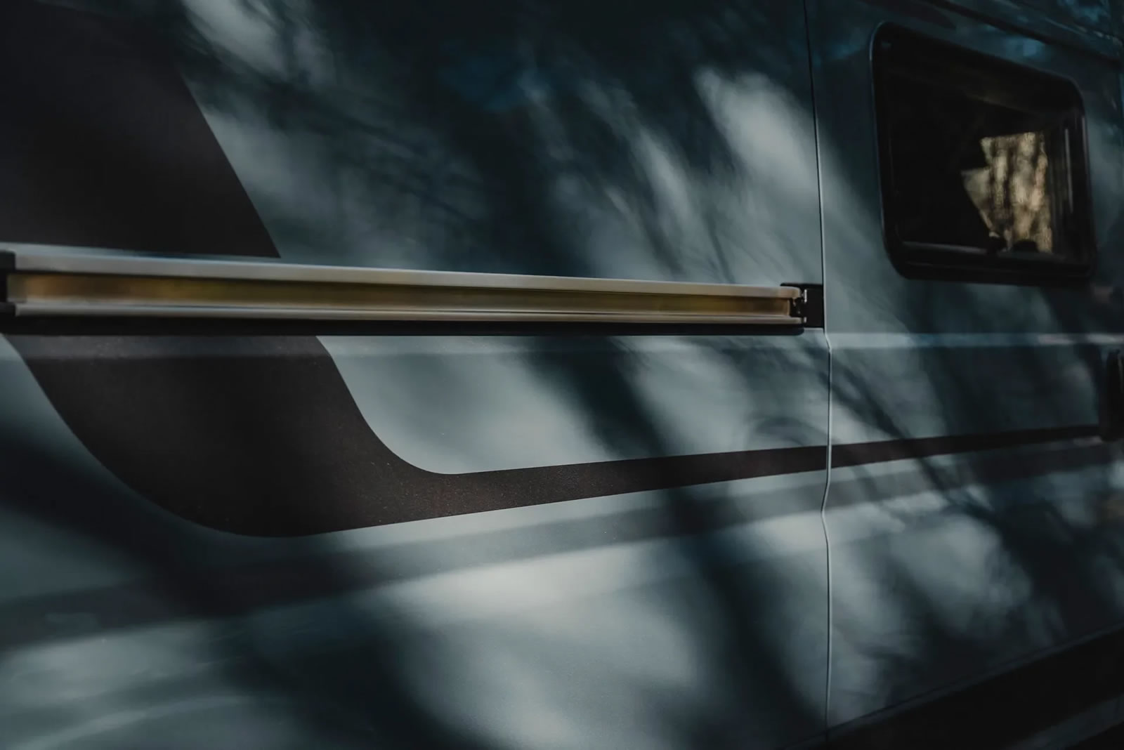 HYMER Redwood zaujme svou výraznou tváří: Ať už v barvách Grigio Campovolo, Storm Blue Metallic nebo Lanzarote Grey, laky karoserie dodávají akcenty. Orámovaná okna pro bezproblémový design, matně černá 16palcová kola a sladěné detaily karoserie mu dodávají moderní a sebevědomý vzhled.